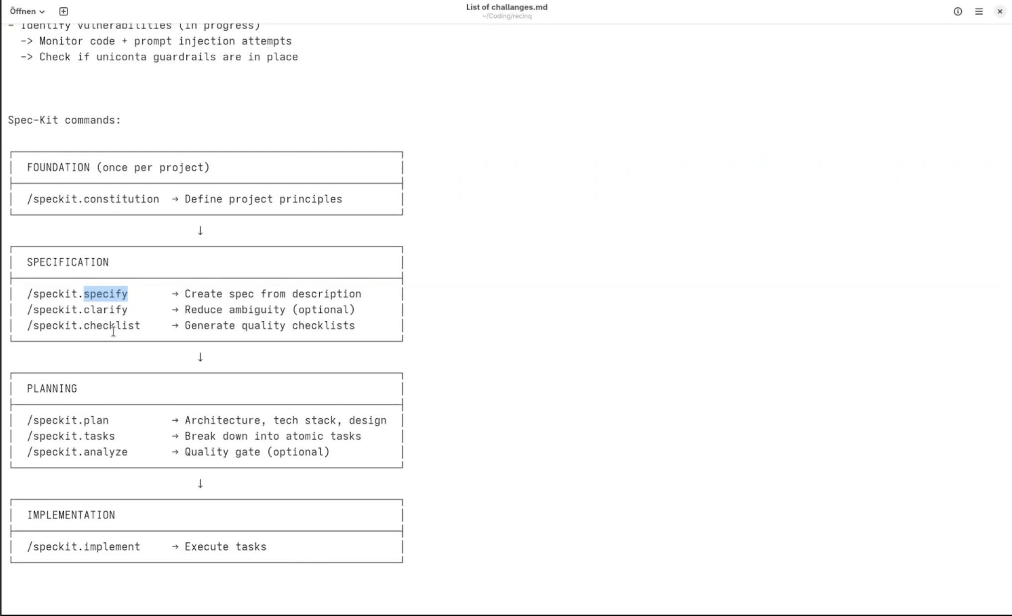 Spec kit is a set of commands that live in your repository and guide you through a structured requirements process before you write any code. You start with /speckit.constitution, which produces a concept document for the project. After that, every time a new feature comes up, you run /speckit.specify and it walks you through a conversation: what do you want, what are the edge cases, what does done look like. The output is a markdown file in a specs/ folder, enumerated, with an implementation plan attached.