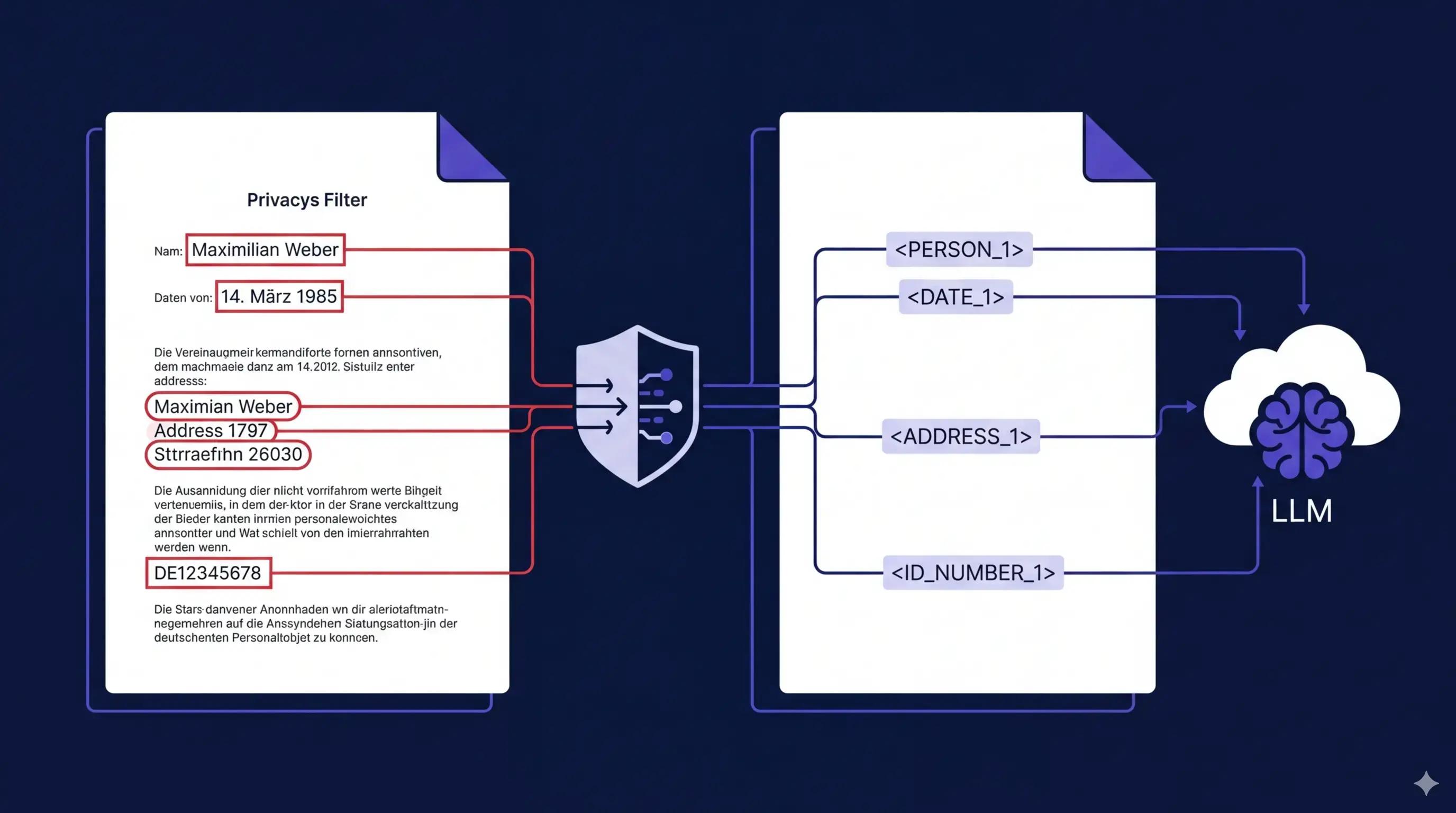 A lawyer pastes a Schriftsatz (client communication or similar) into a chat UI. The text contains names, birthdates, tax IDs, court case numbers, addresses, bank account details. If that text goes to a cloud API as-is, the lawyer has a compliance problem. Manual redaction is tedious and error-prone. The alternative is not using LLMs at all, which is increasingly impractical.