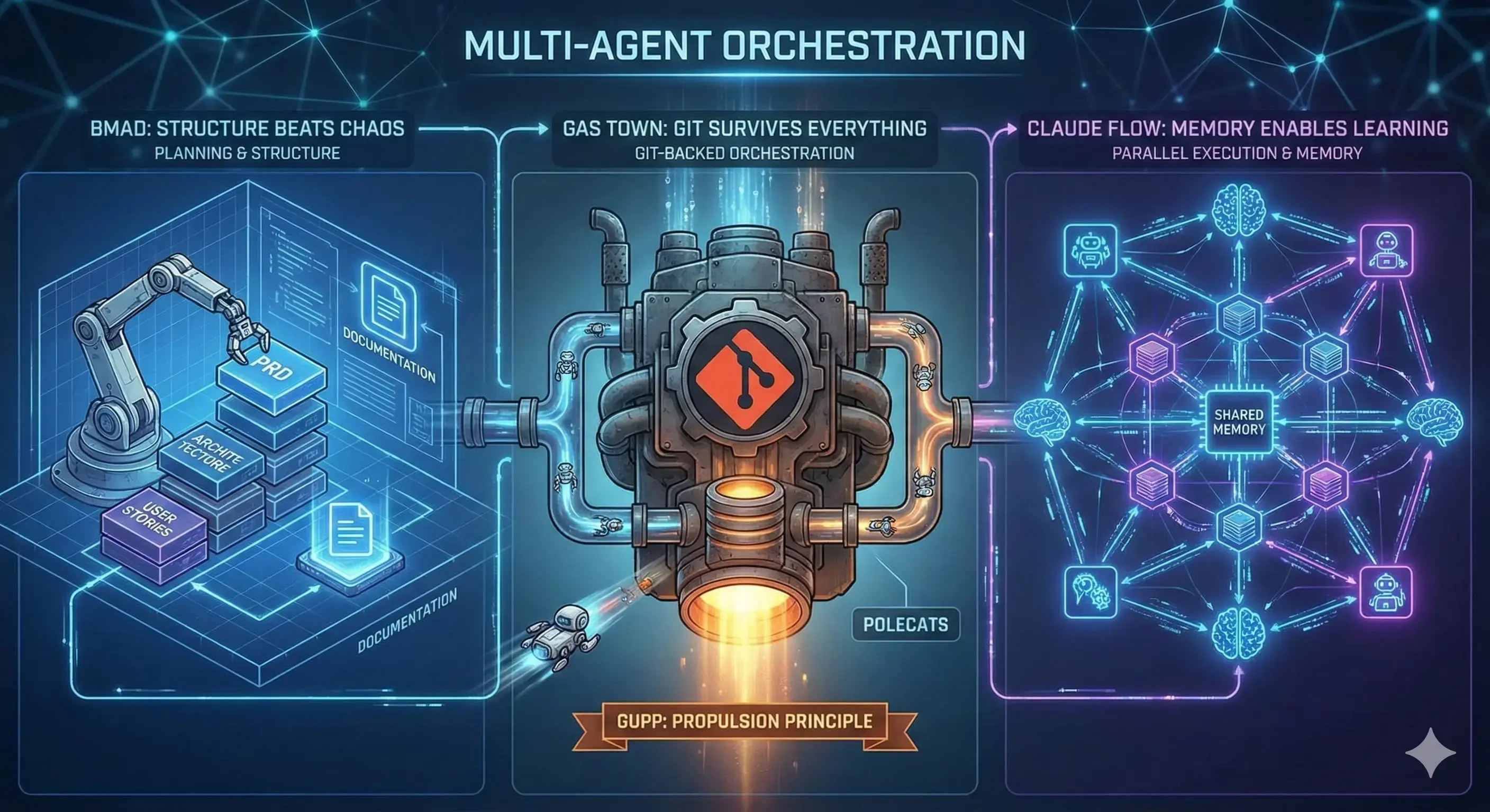 A deep dive into three multi-agent AI orchestration frameworks: BMAD for structured planning, Claude Flow for parallel execution, and Gas Town for git-backed persistence. Plus: how to chain them together.
